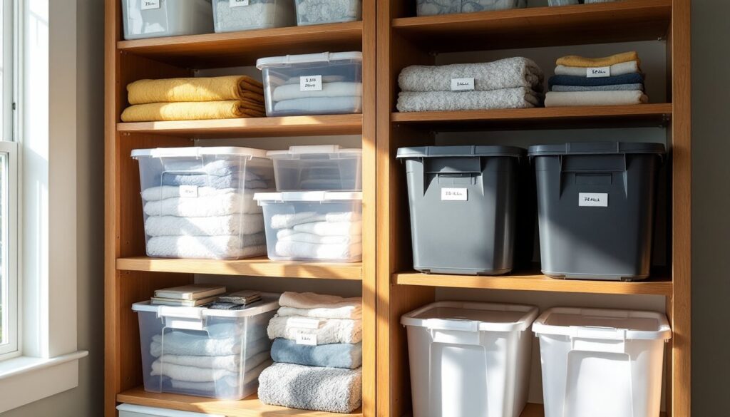 Laundry and linen closets stay neater when bins separate bath towels from hand towels, sheets by bed size, or cleaning supplies by room. A labeled system keeps children and partners from mixing categories or overstuffing drawers.